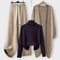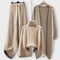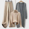 This knitwear set is the definition of elegant comfort. It consists of wide trousers with an adjustable waistband, a high jumper, and a long coat, making it perfect for cooler days without sacrificing style. The soft texture and impeccable fit create a sophisticated look, ideal for wearing at home, at work, or on outings with charm and comfort.
