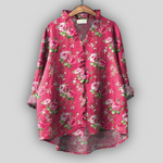 A romantic linen blouse in an intense pink shade with a floral rose pattern that radiates femininity and elegance. The V-neckline with discreet ruffles and the loose fit provide comfort and a breathable feel, while the asymmetric hem with a longer back adds a modern character to any outfit.