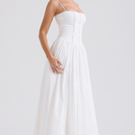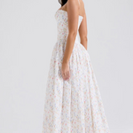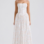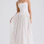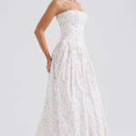 A chic floral dress that showcases femininity with a romantic flair. The fitted bodice with vertical seams accentuates the silhouette, while the wide skirt offers comfort and movement. Perfect for spring and summer occasions, from casual strolls to elegant invitations.
