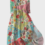 This stunning long dress stands out with its playful patchwork design in vibrant colours, combining pink, green, blue, and yellow. Its unique floral and polka dot pattern adds a retro vibe and special charm, while the waist belt elegantly accentuates the silhouette.